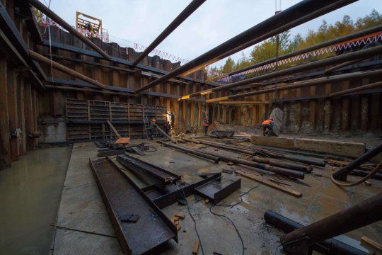 - подкосы – опираются на шпунты и на грунт (подошву фундамента, дополнительные сваи).